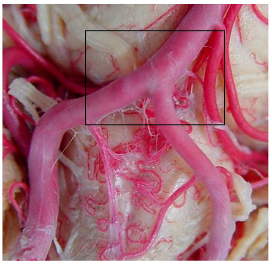 The origin of the trigeminal artery was right-sided and 38 mm from the junction of the vertebral arteries, and its diameter was 4.5 mm. The system of perforating arteries of this variant is very complex because it presents in the lower segment a greater number of perforating trunks (four) and isolated perforators (five); the diameters of the trunks were in the range of 350–600 μm, and the diameters of the single perforating arteries were 200–340 μm. In the MS, we found fewer single trunks (two), and only three single perforating branches. The diameters of the trunks were larger with ranges of 400–850 μm, and the single perforators had ranges of 350–700 μm; we also found that perforators originated from the trigeminal artery in greater proportion as single perforators. In the rostral segment, we found five single trunks, there were three isolated perforators, trunk diameters were 350–500 μm, and isolated perforators were 140–230 μm in diameter. Posterior communicating arteries were present bilaterally. We did not find any structural alteration in the brain studied (Figure 9).