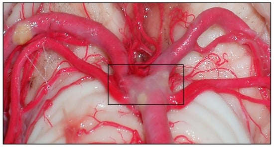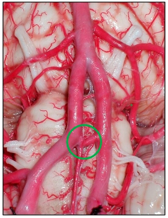 - Idowu, O.E.; Malomo, A.O.; Akang, E.U. Surgical anatomy of the vertebrobasilar territory and posterior circle of Willis. West Afr. J. Med. 2010, 29, 230–234. [Google Scholar] [CrossRef][Green Version]