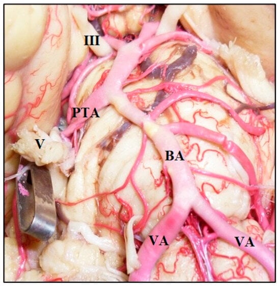 A right persistent trigeminal artery (PTA) and its relationship with the right trigeminal nerve (V). BA, basilar artery; III, oculomotor nerve; VA, vertebral artery.