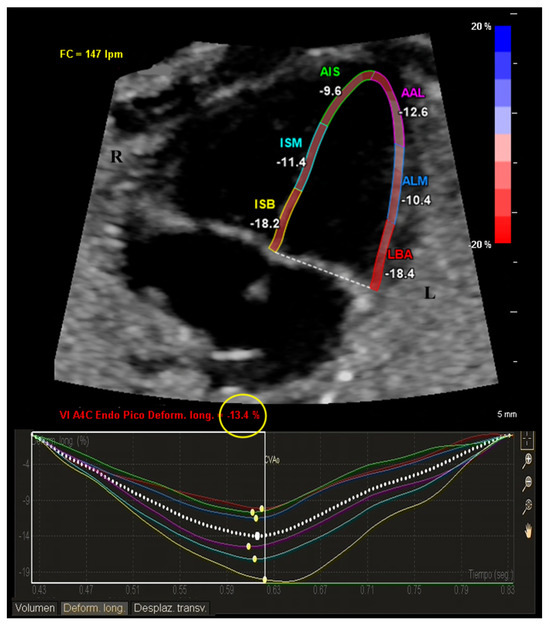 LV longitudinal strain analysis with aCMQ-QLab in FGR stage IV. The software automatically delineated the left-ventricular myocardium, providing LV global longitudinal strain (yellow circle), as well as individual segment measurements; from left to right: basal segment of left-ventricle wall (LBA), middle segment of left-ventricle wall (ALM), apical segment of left-ventricle wall (AAL), basal inter-ventricular septum (ISB), middle interventricular septum (ISM), and apical interventricular septum (AIS). L, left; R, right. Abbreviations differ from the manuscript, due to software language (Spanish).