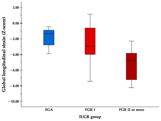 This finding is in line with previously described cardiac remodeling occurring in FGR fetuses [4]. Placental insufficiency leads to fetal hypoxia, causing a decrease in myocardial contractile force (which decreases linearly as local perfusion decreases [15]), and simultaneously decreasing deformation. In cases of chronic hypoperfusion, changes in tissue elasticity may occur, leading to fibrosis and necrosis, causing further decline in deformation, adversely affecting fetal cardiac function [4,15].