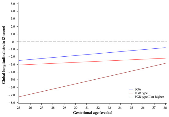Table 3 shows longitudinal analyses for LV strain values across the different FGR groups. For this analysis, FGR groups II, III, and IV were also included as a single entity because of the small number of cases for each. Early cardiac dysfunction was observed even in mild cases since diagnosis, with a trend towards normalization as gestation progressed in the SGA group. A statistically significant lower LV GLS strain was found in severe FGR cases (FGR ≥ II) when compared to SGA and FGR stage I across gestational age (Figure 3). However, there were no significant differences in LV GLS behavior between SGA and FGR stage I.