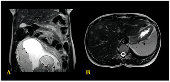 A 33-year-old patient with no significant medical history, prior surgical procedures, or family history of oncological disorders presented to the emergency room (ER) at Community Hospital of Barletta (Italy) due to severe abdominal pain unresponsive to common medications, constipation, and bloating (acute abdomen). The patient was 19 weeks pregnant with her second child; her first pregnancy had been uneventful. Obstetric assessment indicated no issues with the ongoing pregnancy. An abdominal Magnetic Resonance Imaging (MRI) revealed signs of intestinal obstruction suggestive of a sigmoid volvulus. She underwent urgent laparotomy with Hartmann sigmoid resection and colostomy the following day. Biopsy of the surgical specimen unveiled a sigmoid adenocarcinoma G2 causing strictures, ulceration, and full-thickness infiltration of the muscular layer with localised high-grade tumour and extension to the subserosal layer. No lymphatic, vascular, or perineural infiltration was detected. Surgical margins were tumour-free, as were the perivisceral lymph nodes. According to the histopathologic Tumour-Node Metastases staging system (pTNM) [14], the final stage was pT3bN0. Following surgery, a chest radiograph (RX) revealed no tumour-related findings, while an abdominal ultrasound identified a hepatic hyperechoic nodule (11 × 7 mm) in segments VII–VIII of uncertain nature. At 23 weeks of pregnancy, it was decided to transfer the patient to the Central Hospital “Policlinico di Bari” (Italy). Upon admission, her clinical condition was stable, with an Eastern Cooperative Oncology Group (ECOG) [16] performance status 1, with no abdominal pain, a functioning colostomy, normal sinus rhythm on electrocardiogram, and a foetus showing no distress. Blood tests indicated mild anaemia (haemoglobin 8.8 g/dL) but otherwise regular values for electrolytes, liver function, renal function, coagulation, platelets, and white blood cells. Tumour markers were assessed, showing an elevation of Alpha-fetoprotein (AFP) 109 ng/mL (normal values 0–7 ng/mL), while other tumour markers, including Carcinoembryonic antigen (CEA), Cancer Antigen 15.3 (CA15.3), Cancer Antigen 125 (CA125), and Cancer Antigen 19.9 (CA19.9), were within the normal range. During the hospitalisation, an abdominal MRI confirmed the presence of multiple hepatic nodules (diameter < 10 mm), suggestive of neoplastic lesions. The MRI, reported in (Figure 1), also showed a nodule on the parietal slope of the amniotic sac (20 mm) of unknown nature. This finding was not confirmed by ultrasound evaluation of the uterus.