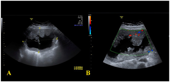 (A) Sonographic image showing the 16 × 11 cm adnexal cyst with a solid component; (B) Sonographic image showing intralesional vascularization.