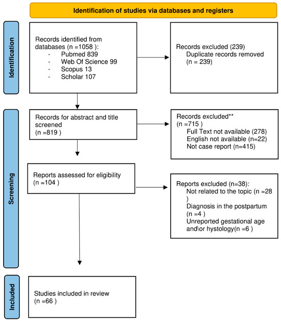 A total of 1058 studies were initially identified. Firstly, duplicates (n = 239) were removed, resulting in 819 studies for abstract and title screening. Among these, 715 were excluded as they did not meet the inclusion criteria. Out of the remaining 104 studies eligible for full-text analysis, 28 were excluded because they were irrelevant to the topic, 6 due to unreported gestational age and histology, and 4 because the tumour diagnosis was made in the postpartum period. Consequently, 66 studies were ultimately included. See (Figure 4) for a summary of the selection process.