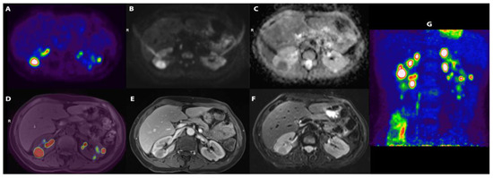 (A) [18F]-FDG transaxial image demonstrating a number of areas of uptake of the tracer; (B) DWI-b1000 (high. Res. Resolve) and (C) transaxial DWI-ADC (high. Res. Resolve) showing corresponding areas of restriction of diffusivity; (D) [18F]-FDG and T1 vibe fused images; (E) transaxial T1 vibe after contrast enhancement not showing significative enhancement; (F) transaxial T2 TSE; (G) [18F]-FDG maximum intensity projection (MIP) showing a number of lesions with high uptake of the tracers in kidneys.