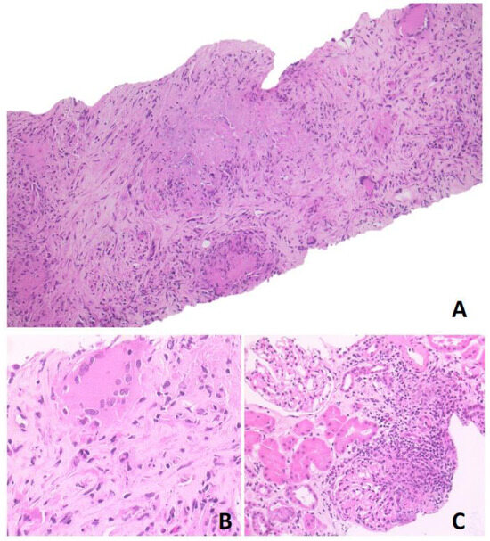 Kidney biopsy was performed in 27 (64.3%) patients, unfortunately, the biopsy was non-diagnostic in 2 patients [18,32]. Indeed, a re-biopsy was performed in the two cases to achieve a definite diagnosis [33,34]. Nephrectomy was performed in 19 (45.2%) patients, partial in 5 (26.3%), and radical in 14 (73.7%). Histological examination of both kidney biopsy and nephrectomy (data available in 39 cases) showed the presence of granulomatous inflammation in 35 (89.7%) specimens. Glomerulonephritis was less frequent, found in 26 (66.7%) specimens. Therefore, isolated extravascular granuloma without any other histological changes was confirmed in seven (17.9%) cases.