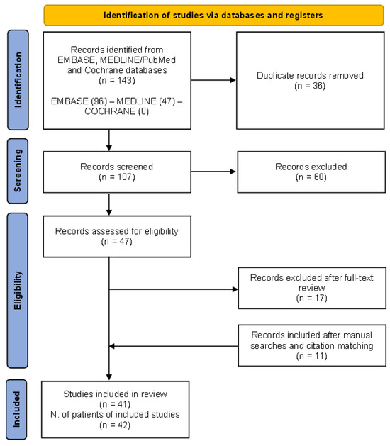 The preliminary search produced 143 papers, with 36 articles being duplicates. Additionally, 60 articles were excluded based on title and abstract screening. Eligibility assessment was conducted on 47 articles. Out of these, 17 were excluded as they did not meet the inclusion criteria (reviews, editorials, conference papers), while 11 were added after manual searches and citation matching.