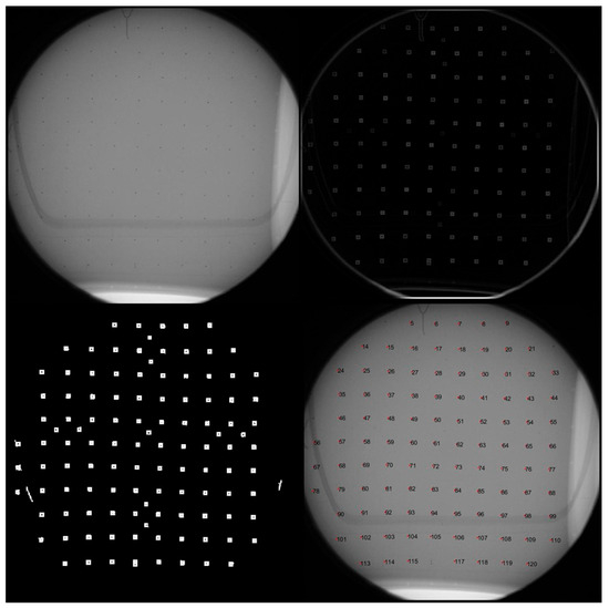 The target labeling process began with an example of captured imagery (top left) followed by morphological enhancement (top right). Extracted binary labels (bottom left) were then semi-automatically matched to image point labels through user selection. The centroids of the target field (bottom right) could then be extracted from the imagery. Note the significant curvilinear distortions visible in the image of the square target grid.