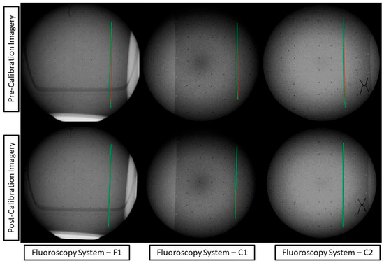 Imagery captured across fluoroscopy systems pre-correction and post-correction using distortion model parameters. Imagery is annotated with the curve of the tantalum beads represented by the green curve and an idealized straight line of the beads with a red line.