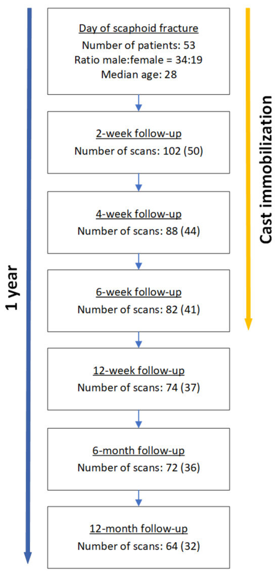 Figure 1 visualizes the six follow-ups with the number of assessed scans. During follow-up of one year, a total of six bilateral scans were planned per patient at 2, 4, 6, 12 weeks and 6 and 12 months after trauma. Cast immobilization on the fractured side ranged between four and twelve weeks after trauma. Scans with the fractured scaphoids were obtained with the wrist immobilized in a fiberglass cast at the 2-, 4- and sometimes at the 6-week follow-ups, which is known to have no considerable effects on interobserver variability [19].