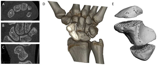 - Daniels, A.M.; Wyers, C.E.; Janzing, H.M.J.; Sassen, S.; Loeffen, D.; Kaarsemaker, S.; van Rietbergen, B.; Hannemann, P.F.W.; Poeze, M.; van den Bergh, J.P. The interobserver reliability of the diagnosis and classification of scaphoid fractures using high-resolution peripheral quantitative CT. Bone Jt. J. 2020, 102-B, 478–484. [Google Scholar] [CrossRef]