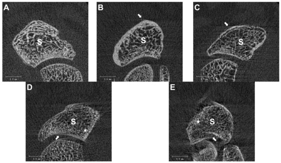 Visual grading scale of the scaphoid: (A) Grade 1, no visible motion artifacts. (B) Grade 2, slight horizontal streaks (white arrow). (C) Grade 3, prominent horizontal streaks (white arrow), intact cortex. (D) Grade 4, prominent horizontal streaks, minor disruptions of the cortex continuity (white arrow), and minor trabeculae smearing (white asterisk). (E) Grade 5, prominent horizontal streaks, major disruption of the cortical continuity (white arrow), major trabecular smearing (white asterisk). S, scaphoid.