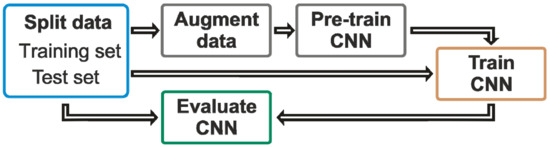 The next step is to refine the pre-trained neural network on the actual dataset. This procedure is referred to as transfer learning. The weights or pre-trained parameters of the network with the artificially treated data are used as a starting point for the training of the final neural network. The pre-trained neural network is refined using the actual patient data and it is trained to classify the quality categories of the data. The dataset was split into training and test datasets following an 80/20 percent split. The workflow of the experiment is shown in Figure 5.