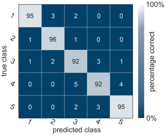 The confusion matrix of the deep-learning-based classification is shown in Figure 6. These results show a high degree of agreement of 92% and 95% (bright diagonal entries) with the result of the image quality grading by the three trained operators. The 3D-CNN classifier reached a ROC-AUC score of 0.94 as well as specificity and precision values of 0.93 and 0.91, respectively. There was only some cross-talk: the first class, for instance, showed 3% wrong categorizations in the second and 2% in the third predicted class.