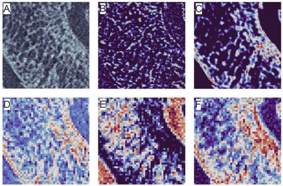 Illustrative example of a section of a CT dataset. (A) Example of a microCT slice. (B–F) The images (B–F) show the response of the first layer of the neural network to the input image shown in (A).