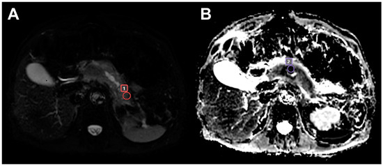 ROI placement in a bifocal ductal adenocarcinoma of the pancreas: (A) a DWI image at b0 with an ROI in the tail tumor (1); and (B) an ADC image with an ROI in the trunk tumor (2).