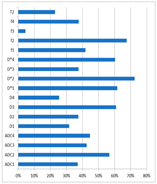 A comparison of the measurement results in the control and study groups is presented in Table 2. Significant differences were observed in all the parameters, except for D4, f3, and T2. A similar result was found in the AUC analysis (Table 3). Interestingly, all the D* measures had an AUC value of 1.0. The graph presenting the comparison of the coefficients of the tested parameters in the control group can be found in Figure 2.