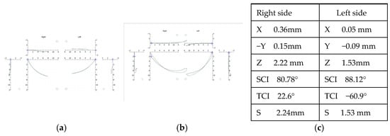 The position of the maxillary cast is registered by the mean of a kinematic facebow transfer stand. The mandibular cast is mounted in the CPV (Figure 5a) (Gamma dental Klosterneuburg, Austria) with a reference position (RP) bite. The CPV allowed us to reposition each joint separately in all 3 planes of space and individually based on the cartesian coordinate system (X, Y, Z axes) with an accuracy ≤ 0.1 mm (www.gammadental.com accessed on 29 February 2024, 20:00). The changes brought to the condylar position were based upon the subject’s individual condylographic tracings and their sensitivity to palpation of muscles and ligaments.