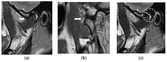 T2 images of magnetic resonance imaging (MRI): (a) maximal intercuspal position (white arrow shows the position of displaced disc); (b) open mouth position (white arrow shows the position of disc above the condylar head). (c) The disc is displaced in the 10 o’clock position based on Katzberg & Tallents [].