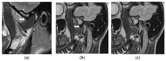 The DC/TMD recommend Magnetic Resonance Imaging (MRI) for the confirmation of a provisional clinical diagnosis []. MRI is considered the most effective and non-invasive imaging tool for the evaluation of TMJ soft tissues, the disc–condyle relationship, and for the determination of the character of disc displacement, including position and shape [,]. High-resolution MRI 3 tesla allows for a better visualization of bony alterations and joint effusions. Previous studies suggested that 3.0 T MRI at the same resolution as 1.5 T yielded better results for the perceptibility of joint structures without increasing the examination time. The 3 T unit delivers images of better quality regarding the evaluability of disc position and shape as compared to 1.5 T MRI and thus provides added diagnostic assurance that is critical for therapeutic decisions [,]. The standard protocol for an MRI diagnosis of anterior disc displacement uses the most superior surface (12 o’clock position) of the condyle as a reference point for the posterior band of the disc. The posterior band of the disk located anterior to the 12 o’clock position correlates to anterior disk displacement []. A few studies have shown that the average position of the posterior band in asymptomatic individuals varies from 5° to 10° from the 12-o’clock depending on the intermediate zone criteria [,,,].