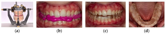 Based on condylographic data, adjustments were made on a CPV at the condylar level; then, a bite registration in therapeutic position (test bite) was fabricated. After setting and trimming, this test bite was inserted into the patient’s mouth, and the patient was asked to open and close and to protrude and retrude to clinically verify whether the luxation was still present. If the luxation was still present, the same process was applied again with adjusted parameters given by condylographic tracings until there was no more detectable joint clicking. Once there was no more clicking, the patient was asked to bite on the test bite for 4 min, after which the palpation of muscles and ligaments was performed again. Based on the reduction in the sensitivity to muscle and ligament palpation (VAS), the test bite was refined. The position achieved with the final test bite corresponded to ThP. From this therapeutic position, a full-coverage mandibular CMR stabilizer (Figure 5c) was fabricated using self-cure translucent dental orthodontic resin material (Scheu dental, Germany, https://scheu-dental.com/fileadmin/six/4390313_E-STEADY-RESIN-Polymer_Vario.pdf accessed on 29 February 2024, 20:30). After insertion in the mouth, the proper fit of the CMR stabilizer on mandibular teeth was verified as well as the occlusion parameters (Figure 5d).