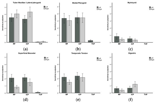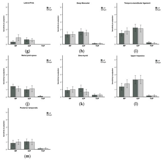 The sensitivity to pain in muscle palpation was significantly reduced in every structure palpated (Figure 6a–m). The tuber maxillae, medial pterygoids, superficial masseter, temporalis tendon, deep masseter, and temporomandibular ligaments were sensitive in RP and ICP. Their sensitivity was close to zero after 4 min in ThP (Figure 6a,b,d,e,h,i). The postural omohyoid and upper trapezius muscles (Figure 6k,l) saw their sensitivity reduce.