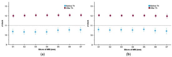 Our MRI evaluations showed a statistically significant difference between the two measurement points (before therapy and after 6 months of CMR therapy) regarding the mean of disc displacement in clock position for each slice and for both joints (p < 0.001, Table 4). After the CMR therapy, the mean clock positions were close to 12 o’clock for all slices and for both joints. The distance between the mean value and 12 o’clock, which is the normal position, was less than one standard error of the mean in all cases. Before CMR therapy, the mean values were close to 10:30. The highest mean value was 10:32 with respect to the right joint (Figure 7a) and 10:36 regarding the left joint (Figure 7b). After CMR therapy, no subject had position values which were smaller than 11:30 or larger than 13 o’clock. Before CMR therapy, the individual values ranged between 9:30 and 11:30; thus, no subject had a normal position (see also Table 4).