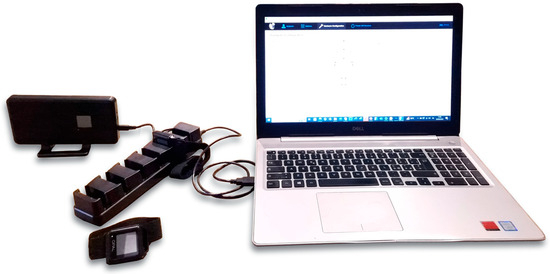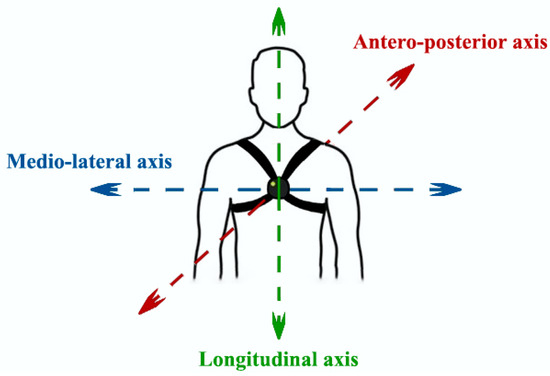 The Mobility Lab System (APDM wearable technologies Inc., Portland, OR, USA) is a technically advanced platform for the analysis of human movement, and is used in both clinical and research settings. In clinical practice, it is useful for treatment planning and monitoring patients. In research, it provides valuable data for scientific studies focused on mobility disorders [31,32,33]. This system is composed of both hardware and software components. The hardware is composed of an access point, a docking station, and inertial sensors (OPAL sensors), while the software is based on a dedicated application, namely, Mobility Lab software version 2 (Figure 1). The OPAL sensors are basically IMUs, which include tri-axial accelerometers (14-bit resolution, bandwidth of 50 Hz, and range of ±16 g), tri-axial gyroscopes (16-bit resolution, bandwidth of 50 Hz, and range of ±2000 deg/s), and tri-axial magnetometers (12-bit resolution, bandwidth of 32.5 Hz, and range of ±8 Gauss). These sensors allow for linear acceleration and angular velocity signals to be acquired with a sampling frequency up to 200 Hz. Moreover, the sensors are charged and configurated by means of the docking station. The access point provides the system with wireless communication capability by means of the Bluetooth 3.0 protocol, allowing for real-time data transmission from OPAL sensors to a host computer. Finally, the Mobility Lab software produces detailed reports based on objective metrics related to gait, balance, and movement patterns. In the present work, a single OPAL sensor placed on the sternum was used (Figure 2). The Mobility Lab System has been proven to be repeatable and accurate [34,35].