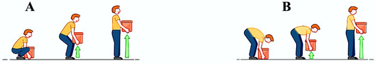 Each subject participated in a session divided into two trials. The first trial consisted of 20 consecutive liftings according to the squat technique—namely, with back extended, legs flexed, rigid arms, and trunk flexed at the hip joints—associated with a safe posture. The load had to be gripped while keeping the legs apart—with a distance between the feet of 20/30 cm—in order to ensure balance during lifting (Figure 3A). The second trial consisted of 20 consecutive liftings associated with an unsafe posture; the liftings were performed with a curved back and non-flexed legs (Figure 3B). Each lifting task was carried out using a plastic container (56 × 35 × 31 cm3) with weights equally distributed inside. Squat and stoop techniques were widely regarded as the “correct” and “incorrect” techniques for lifting activities, as has been reported in several articles in the scientific literature [36,37]. The details regarding the execution of the study protocol are reported in the Table 2.