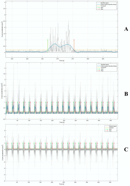 We performed 3 steps to segment the signals. Firstly, the original signal was filtered using a 4° order Butterworth band-pass filter with a band pass ranging from 1 to 50 Hz in order to remove mainly the continuous or DC component. Secondly, the signal was rectified and then filtered by means of a Savitsky–Golay filter [38], with a polynomial order and frame length equal to 4 and 1101, respectively. Finally, an empirical threshold for each subject was set; therefore, from the intersection between the threshold and the final filtered signal, the start and stop points—necessary to segment the signal in the individual region of interest (ROI) corresponding to the lifting tasks—were detected (Figure 4A,B). From our knowledge of the start and stop points, we extracted the ROIs on the original signal (Figure 4C).