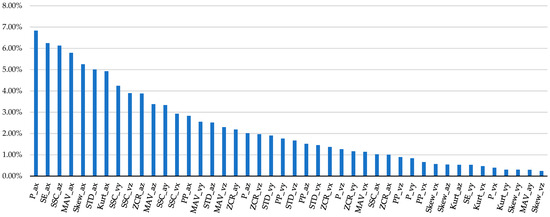 Figure 5 shows the feature importance results based on the IG method, and it emerged that 44 features out of 54 (81.5%) had non-zero values.