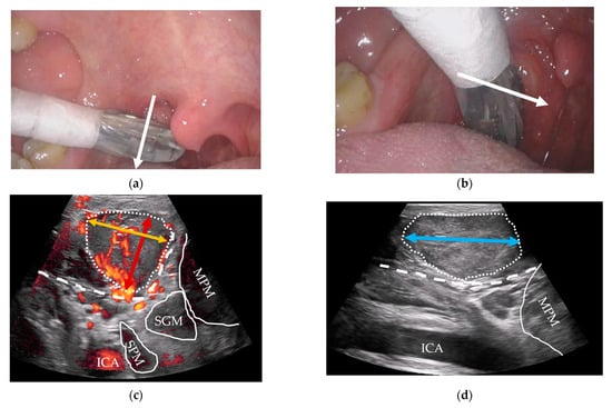Transoral US of the palatine tonsils: (a) a sheathed US transducer placed on the right palatine tonsil (arrow: swipe direction cranial-to-caudal) in the transverse plane; (b) sagittal plane (arrow: swipe direction lateral-to-medial); (c) transverse US image with Power Doppler of a right palatine tonsil tumor (dotted outline) with underlying constrictor muscle (dashed line), internal carotid artery (ICA), stylopharyngeus muscle (SPM), styloglossus muscle (SGM), and medial pterygoid muscle (MPM). The anteroposterior (red bi-directional arrow) and mediolateral (orange bi-directional arrow) tumor diameters are shown; (d) sagittal US image of the same tumor (dotted outline) with the underlying constrictor (dashed line), ICA, and MPM. In sagittal view, the MPM can be used as a craniolateral landmark. The craniocaudal diameter of the tonsil is shown using a blue bi-directional arrow.