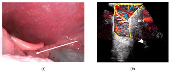 Transoral US of the lingual tonsils: (a) a sheathed US transducer placed on the left lingual tonsil (arrow: swipe direction lateral-to-midline) in the sagittal plane; (b) sagittal US image with Power Doppler of the lingual tonsil (yellow outline), a tumor-suspected area (dotted outline), underlying base of tongue musculature (BOT), and the hyoid bone’s acoustic shadow (white arrowhead). The craniocaudal (blue bi-directional arrow) and anteroposterior (red bi-directional arrow) diameters are shown on the tumor-suspected area.
