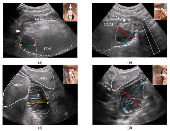 Transcervical US of the palatine and lingual tonsils. Transducer orientations are represented on the top right of each image with a white arrow representing the swiping directions: (a) oblique transverse US image of the base of tongue with the geniohyoid (GHM), genioglossus muscles (GGMs), intrinsic tongue muscles (ITMs), hyoglossus muscle (arrowhead), oral surface of the tongue (dashed line), and a hypoechoic endophytic tumor in the right base of tongue (dotted outline). The mediolateral diameter of the tumor is shown (orange bi-directional arrow); (b) sagittal US image of the same tumor with the hyoid bone’s acoustic shadow shown (white outline)—craniocaudal (blue bi-directional arrow) and anteroposterior (red bi-directional arrow) tumor diameters; (c) Oblique transverse US image of a benign hyperplastic palatine tonsil (PT, dotted outline), the submandibular gland (SMG), tongue, and mediolateral diameter of the PT (orange bi-directional arrow); (d) sagittal US image of the same PT with the mandible’s acoustic shadow shown anteriorly as a landmark for the anteroposterior diameter (red bi-directional arrow). The craniocaudal diameter (blue bi-directional arrow) of the PT is parallel to the hyperechoic mucosal surface seen below the tonsil.