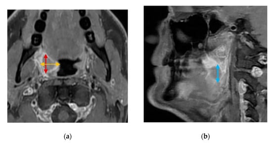 Contrast-enhanced, T1-weighted MRI images of a stage T1 squamous cell carcinoma of the right palatine tonsil: (a) axial orientation showing the mediolateral (yellow bi-directional arrows) and anteroposterior (red bi-directional arrows) diameters of the tumor; (b) sagittal orientation showing the craniocaudal (blue bi-directional arrows) diameter of the tumor.