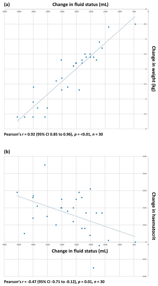 Relationship between (a) change in weight, kg, pre- and post dialysis and volume of fluid, mL, removed during haemodialysis; and (b) change in haematocrit pre- and post dialysis and volume of fluid removed.