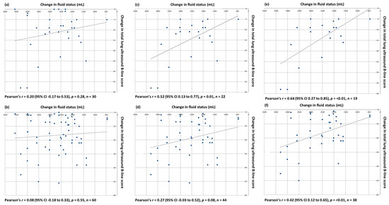 Relationship between volume of fluid, mL, removed during haemodialysis and change in total LUS B-line score for all study participants: (a) primary scorer, (b) blinded scorers; excluding participants with minimal B-lines on their baseline ultrasound: (c) primary scorer, (d) blinded scorers; and excluding participants with minimal B-lines and/or ILD: (e) primary scorer, (f) blinded scorers.