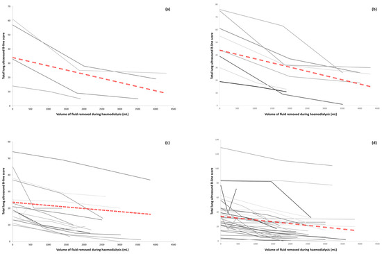 In total, 3/30 (10%) participants had concomitant interstitial lung disease (ILD), recognised as a potential confounder in the assessment of B-lines on an LUS. None of the patients were known to have ILD prior to recruitment, with the diagnosis only made during this study’s CT. A reduction in total LUS B-line scores was still seen in these three participants by all LUS scorers; however, when they were excluded from the data analysis the correlation between the reduction in the total LUS B-line score and volume of fluid removed during haemodialysis improved for the remaining study participants (Figure 2e,f).