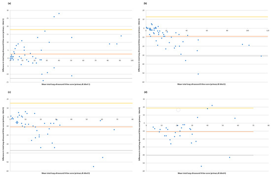 Bland–Altman plots assessing pairwise agreements for total lung ultrasound B-line scores (primary operator vs. blinded scorers 1–4). (a) Primary bedside operator vs. blind scorer 1; number of paired scans = 54; Pearson’s r = 0.94, p = <0.01; Bland-Altman analysis shows mean difference of 2.6 with 95% limits of agreement of −12.6 to 17.9. (b) Primary bedside operator vs. blind scorer 2; number of paired scans = 54; Pearson’s r = 0.94, p = <0.01; Bland-Altman analysis shows mean difference of −9.0 with 95% limits of agreement of −30.9 to 12.8. (c) Primary bedside operator vs. blind scorer 3; number of paired scans = 42; Pearson’s r = 0.78, p = <0.01; Bland-Altman analysis shows mean difference of −10.9 with 95% limits of agreement of −37.2 to 15.4. (d) Primary bedside operator vs. blind scorer 4; number of paired scans = 30; Pearson’s r = 0.53, p = <0.01; Bland-Altman analysis shows mean difference of −10.7 with 95% limits of agreement of −40.2 to 18.8.