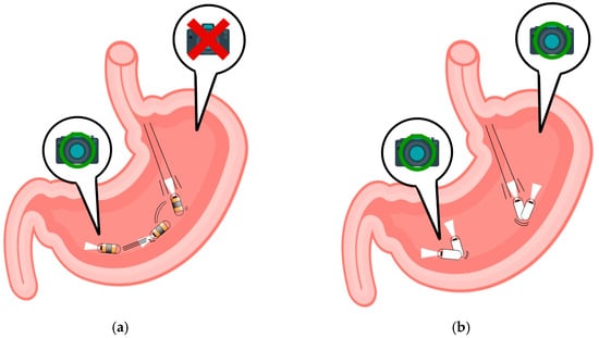 The global endoscopy market is experiencing steady increase, transcending geographical boundaries, as highlighted by its expansion beyond the confines of the United States and China []. Conventional wired endoscopy, while a cornerstone in diagnostics, has several limitations, such as the need for sedation, active involvement, and specialized techniques []. In contrast, wireless capsule endoscopy (WCE) offers a more patient-friendly alternative, with individuals simply ingesting a capsule with water. The transmitted capsule images are subsequently reviewed by endoscopists, typically providing diagnostic results within an average of 30–40 min []. The simplicity and convenience of wireless capsule endoscopy have resulted in a recent surge in popularity, showing the potential to outpace wired endoscopy []. However, the current focus of WCE is predominantly on the small intestine []. This preference arises from the narrow luminal diameter of the small intestine within the gastrointestinal tract, enabling WCE to effectively capture essential imaging areas [,]. Nonetheless, technological advancements are propelling efforts to expand WCE capabilities for observing the upper gastrointestinal tract [,,,]. Notably, magnetic-controlled capsule endoscopy (MCCE) has emerged as a promising alternative to passive and uncontrollable WCE, demonstrating the capability to image landmark areas in the upper gastrointestinal tract []. Figure 1 presents a comparative concept between the existing WCE and the ongoing development of MCCE.
