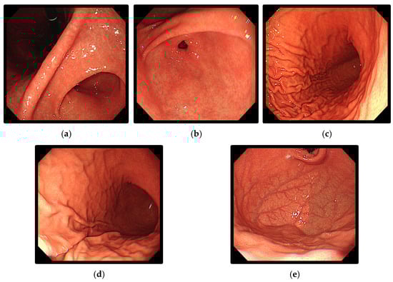 Examples of upper gastrointestinal landmarks: (a) Angulus; (b) Antrum; (c) Body A; (d) Body B; (e) Cardia and Fundus.