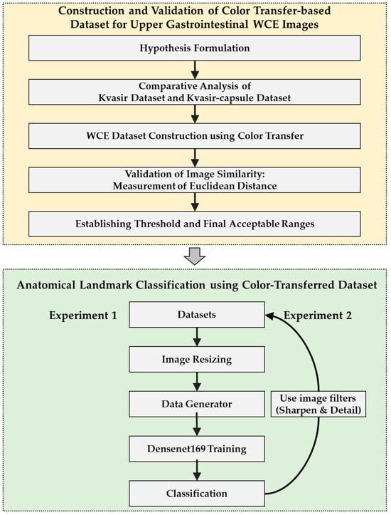 This paper is organized as follows: Section 2 provides an overview of upper gastrointestinal tract landmark classification, introduces the dataset, and outlines experiments for model selection and resolution comparison. It details the hypothesis formulation, the method for selecting an image similarity proof method to create a dataset mimicking a WCE image, the image similarity proof experiment using the Kvasir and Kvasir-capsule datasets, the production of a WCE dataset for the upper gastrointestinal tract, and the image similarity verification process, including the resulting threshold and error range selection. In Section 3 (Results), we describe an experiment confirming landmark classification accuracy using the DenseNet169 model with the WCE datasets from Section 2. The section explains the results of enhanced classification accuracy achieved through image preprocessing. Section 4 (Discussion) discusses the experimental results, considers limitations, and proposes future research directions. Section 5 (Conclusions) provides a summary of this research.