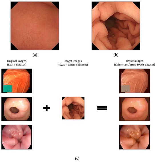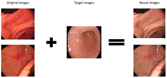 To validate our hypothesis, two distinct proof procedures were implemented. First, a color transfer from the Kvasir-capsule image to the Kvasir image was executed. Utilizing the well-known color transfer algorithm, as reported by Reinhard et al., this algorithm transmits only red, green, and blue (RGB) colors by calculating the mean and standard deviation (SD) of the RGB channel of the target image in the original image []. Notably, the original image’s features remain untouched, and only the color is transferred to the resulting image. In a similar context, Yin et al. conducted a study leveraging color transfer to identify faces by race through the transfer of skin color []. The formula for color transfer is expressed as follows: