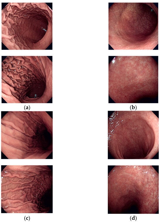 Despite the increasing interest in upper gastrointestinal WCE, there is a limited body of research dedicated to identifying anatomical landmarks through WCE imaging []. This limitation is attributed to the nascent nature of this research domain [,]. Xu et al. proposed a multitask anatomy detection network for gastroscopy, successfully classifying 10 upper gastrointestinal anatomical structures with an average detection accuracy of 93.74% and classification accuracy of 98.77% []. Takiyama et al. conducted an automatic anatomical classification study on 27,335 images categorized into esophagogastroduodenoscopy (EGD)-based larynx, esophagus, stomach, and duodenum using a GoogleNet-based architecture []. They further extended their study to classify and evaluate upper, middle, and lower stomachs using a validation set of 13,048 items, achieving a four-class classification accuracy of 97% and a three-position study accuracy of 99%. As indicated above, while studies exist on the identification of upper gastrointestinal landmarks through wired conventional endoscopy, research on upper gastrointestinal landmarks with WCE images has only recently emerged [,]. Further investigations are needed for landmark identification in this specific context. The primary objective of this study was to propose a method for providing uniform and high-accuracy imaging with capsule endoscopic images, incorporating a prelandmark for the upper gastrointestinal tract. This approach aims to facilitate the imaging identification of active capsules within the upper gastric tract, anticipating their future commercial availability. Historically, capsule endoscopic images required video processing due to their lower quality and darker nature than wireless endoscope images. In our effort to enhance WCE images for improved accuracy, akin to wired endoscope images, we engaged in image preprocessing. Consequently, WCE images for the upper gastrointestinal tract became essential for achieving this purpose. However, a significant challenge in this field is the absence of a dedicated public dataset for the WCE images of upper gastrointestinal landmarks, excluding the small and large intestines []. Existing public datasets primarily focus on classifying normal and abnormal diseases across unspecified segments of the gastrointestinal tract []. While capsule endoscopy images of the stomach are available, they often lack coverage of essential imaging areas based on EGD, making it difficult to identify landmarks.