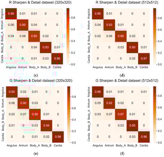 Confusion matrices of the three datasets with the sharpen and detail filter: (a) L sharpen and detail dataset (320 × 320); (b) Z sharpen and detail dataset (512 × 512); (c) R sharpen and detail dataset (320 × 320); (d) R sharpen and detail dataset (512 × 512); (e) G sharpen and detail dataset (320 × 320); (f) G sharpen and detail dataset (512 × 512).