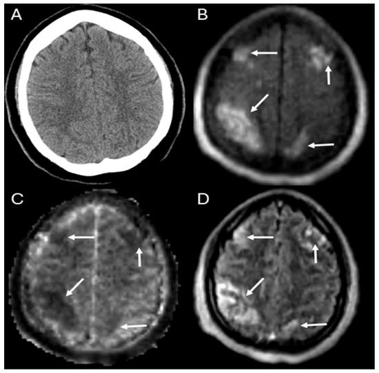 Example case: 31-year-old recently postpartum female with thrombotic thrombocytopenic purpura requiring extracorporeal cardiopulmonary resuscitation after cardiac arrest whose ULF-pMR demonstrated multifocal ischemic stroke (arrows: bilateral frontal and parietal strokes) on the Panels (B) (DWI), (C) (ADC), and (D) (FLAIR), not seen on the HCT (Panel (A)).