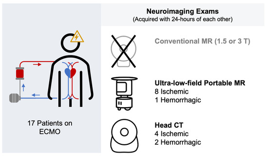 Detection of acute brain injury (ABI) events in patients on extracorporeal membrane oxygenation (ECMO) (Blue: drain cannula; Red: Return cannula) with MR and CT. Patients on ECMO cannot be safely scanned at conventional MR field strengths (1.5 or 3 T); therefore, ultra-low-field portable MR (ULF-pMR) and head CT (HCT) were acquired within 24 h of each other in 17 patients on ECMO. More ischemic ABI events were observed on ULF-pMR compared to HCT (8 vs. 4, respectively). Two hemorrhagic events were observed with HCT compared to one on ULF-pMR.