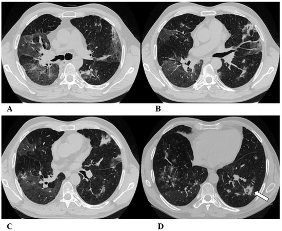 Baseline axial chest CT scans (A,B) showed numerous partially confluent areas of GGO, more represented in the perihilar regions as a result of extensive alveolar damage (white arrow), with some dependent asymmetrical peripheral consolidations (black arrow) like an early ARDS pattern, which made it necessary to hospitalize the patient in the intensive respiratory care unit with nose–tracheal intubation.
