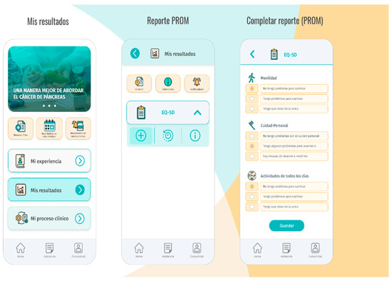 Based on these elements, Contigo was developed as a Progressive Web App (PWA), utilizing web technologies that allow its installation on mobile devices, providing a user experience similar to that of a native application. This means that the application can be installed on any smartphone, regardless of the operating system it uses. The SCRUM agile software development methodology was applied to carry out the development of Contigo. At the end of each iteration, a project Quality Assurance team conducted functional tests to evaluate the quality of development and ensure user satisfaction. The application features a client–server architecture with modular design to facilitate scalability and simplify the incorporation of new functionalities. In its current version, Contigo includes six modules, including El Viaje (The Journey), Mis Resultados (My Results), Mi Experiencia (My Experience), Asistencia (Assistance), Comunidad (Community), and Agendamiento (Scheduling). A brief description of these modules is provided in Table 1, below, and the user interface depicted in Figure 2.